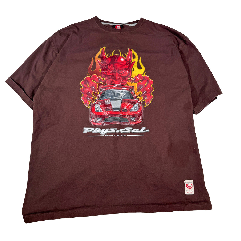 AOP double stitch tee with Phys.sci Racing graphics front and back in glossy screen print. Made in Mexico tag.
